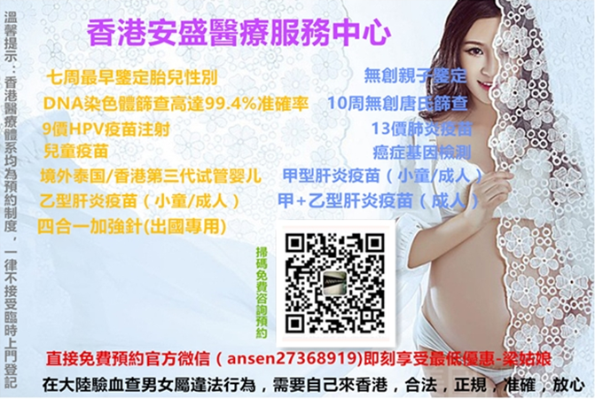 若刪或者打不開請(qǐng)點(diǎn)快照*香港安盛醫(yī)療中心24小時(shí)免費(fèi)咨詢,熱線: 00852-27368366 直接預(yù)約官方微信(ansen27368919)即刻享受最低優(yōu)惠-梁姑娘-*香港化驗(yàn)所做DNA鑒定胎兒性別, 安全-快速-準(zhǔn)確-無(wú)創(chuàng), 1-2天可出鑒定結(jié)果,詳細(xì)流程,歡迎來(lái)電咨詢預(yù)約! 其它項(xiàng)目:(香港無(wú)創(chuàng)親子鑒定、10周無(wú)創(chuàng)唐氏篩查、13價(jià)肺炎疫苗注射、兒童疫苗注射、9價(jià)HPV疫苗注射、試管嬰兒、癌癥基因檢測(cè)…),(在大陸驗(yàn)血查男女屬違法行為,需要自己來(lái)香港,合法,正規(guī),準(zhǔn)確,放心)。