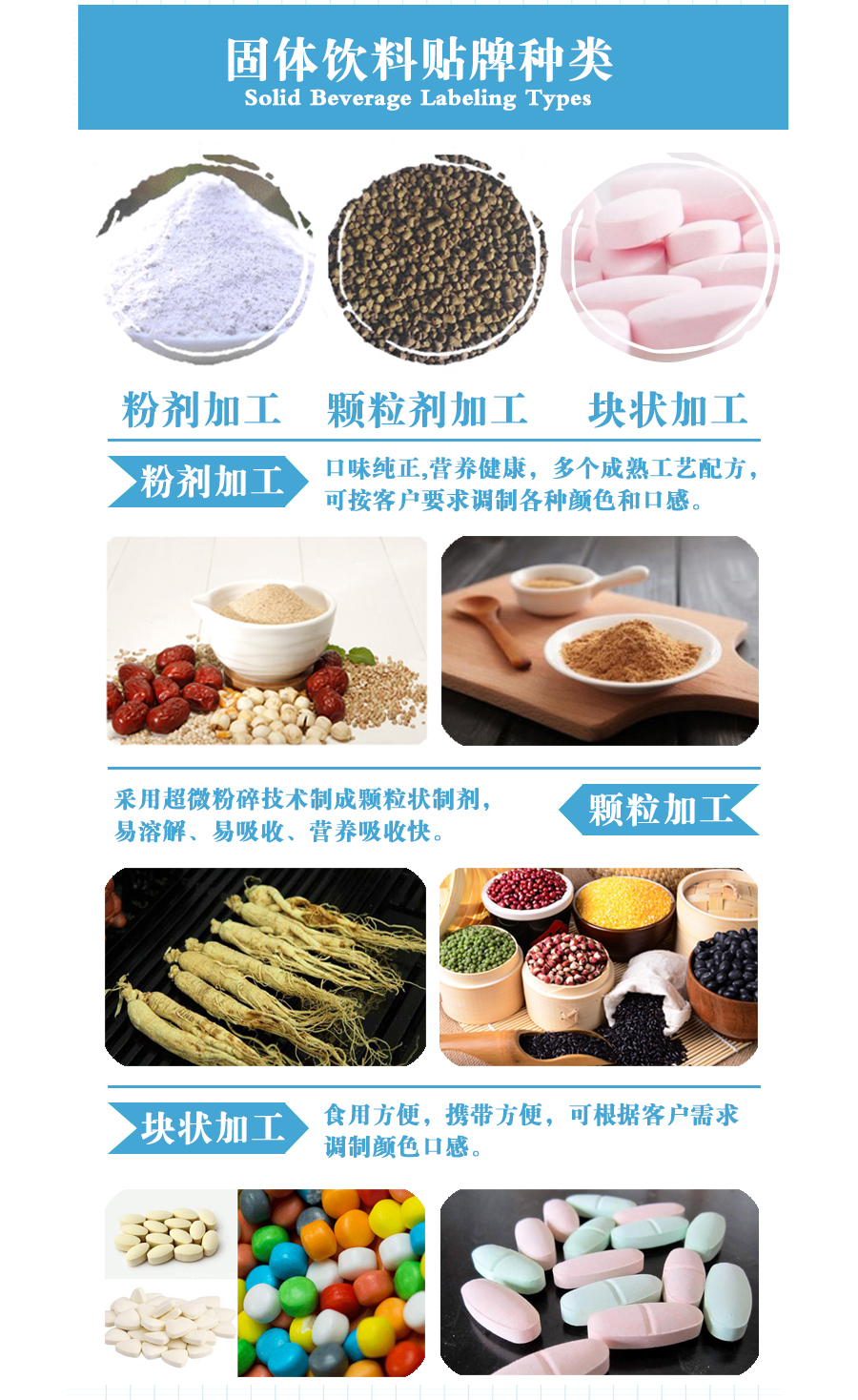 固體飲料是以某種原料為主,添加適量的輔料或食品添加劑制成的固體制品,呈粉末狀、顆粒狀或塊狀。