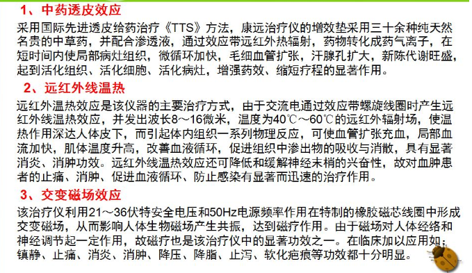 提純磁化的中藥有電熱遠(yuǎn)紅外、針灸、按摩、微量元素等高科技技術(shù)的綜合作用下轉(zhuǎn)化為藥氣離子,并配合性能獨(dú)特的速滲液,穿透皮膚擴(kuò)張汗腺孔使藥氣離子直達(dá)病灶,提高療效,速克頑疾。